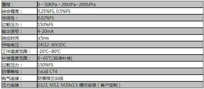 PT124B-281耐腐型防爆压力变送器,采用压阻式传感器芯体(陶瓷&扩散硅),壳体为不锈钢外壳,外壳防护等级为IP65,可带LCD显示,耐腐蚀,宽范围温度补偿、良好的线性、有反极性保护、瞬间过电流、过电压和抗干扰保护措施。应用于液压、油田,矿井,化工,电力,锅炉,天然气等自动化领域的流体压力测量与控制。