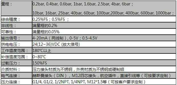 额定量程: 0….1bar至0….1000bar压力范围的测量
